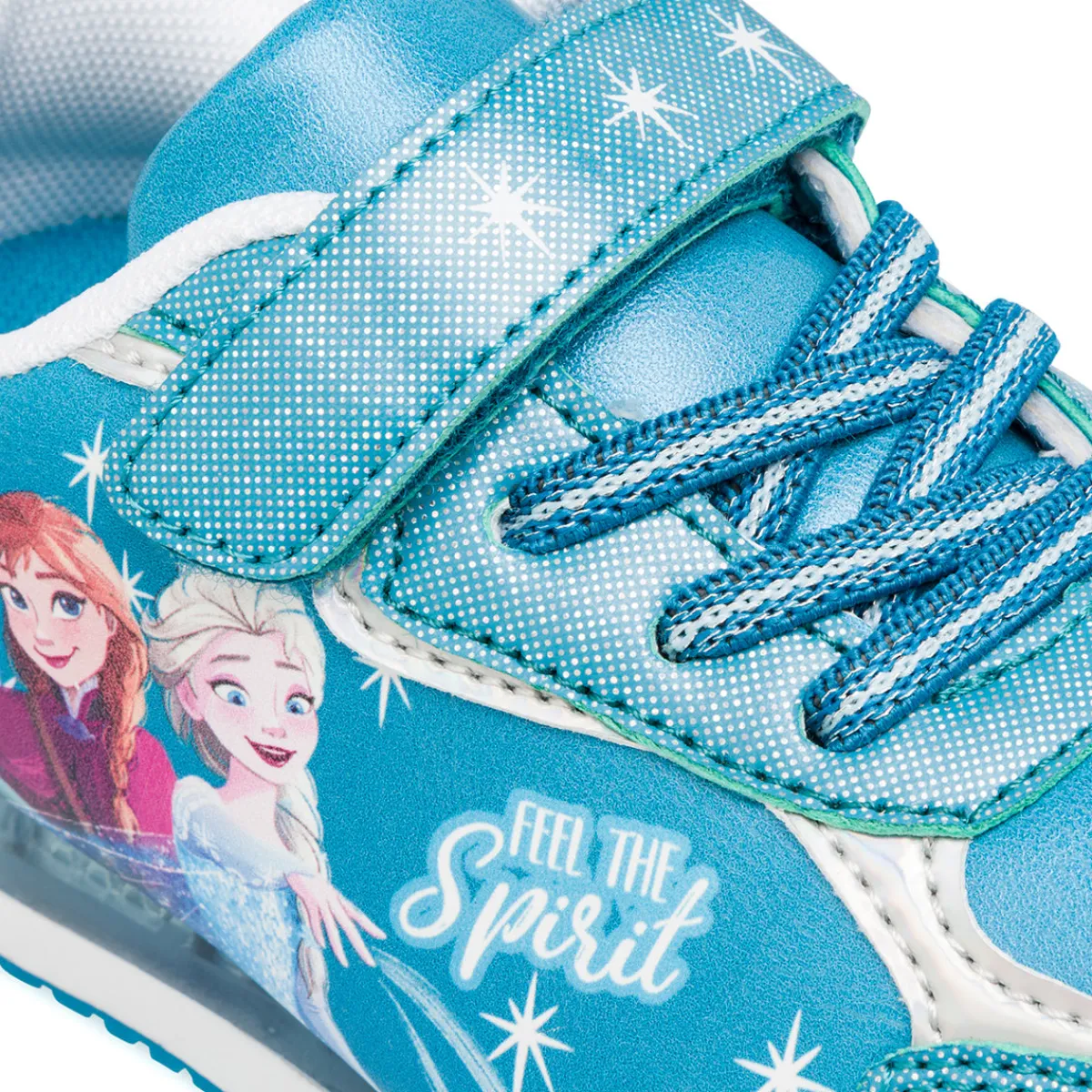 Sneakers da bambina Frozen, in similpelle colore azzurro, stampa laterale e luci nella suola, dettaglio glitter, chiusura con lacci elastici e strappo in velcro.
