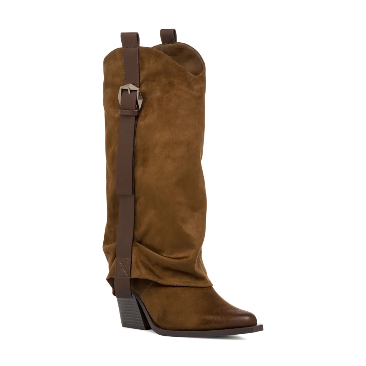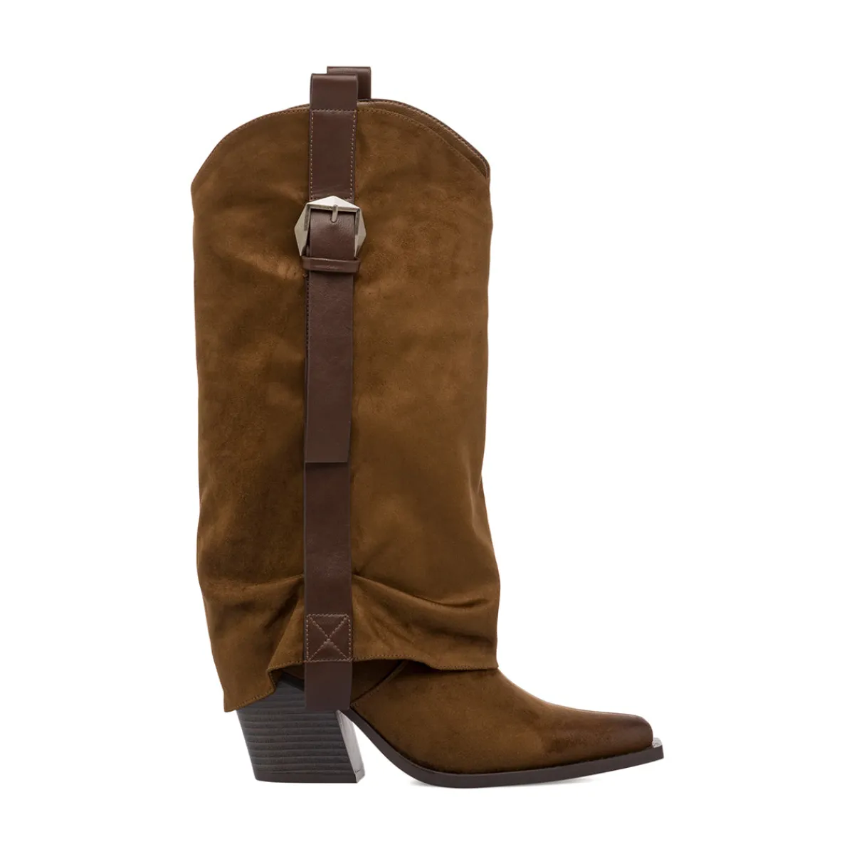 Aggiungi un tocco western al tuo look con questi stivaletti texani marroni da donna di Lora Ferres. Realizzati in similpelle effetto scamosciato, presentano un comodo tacco basso e un cinturino con fibbia. La tomaia morbida e la soletta in materiale sintetico assicurano comfort per tutto il giorno. Perfetti per un outfit casual chic o per una serata speciale. Il fondo delle calzature è in materiale sintetico.