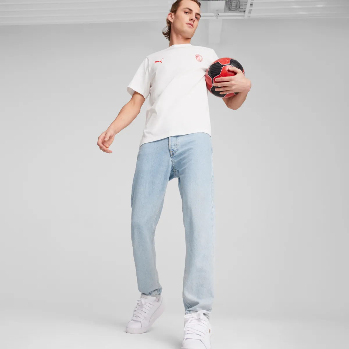T-shirt da uomo Puma in cotone colore bianco, con logo color rosso AC Milan.