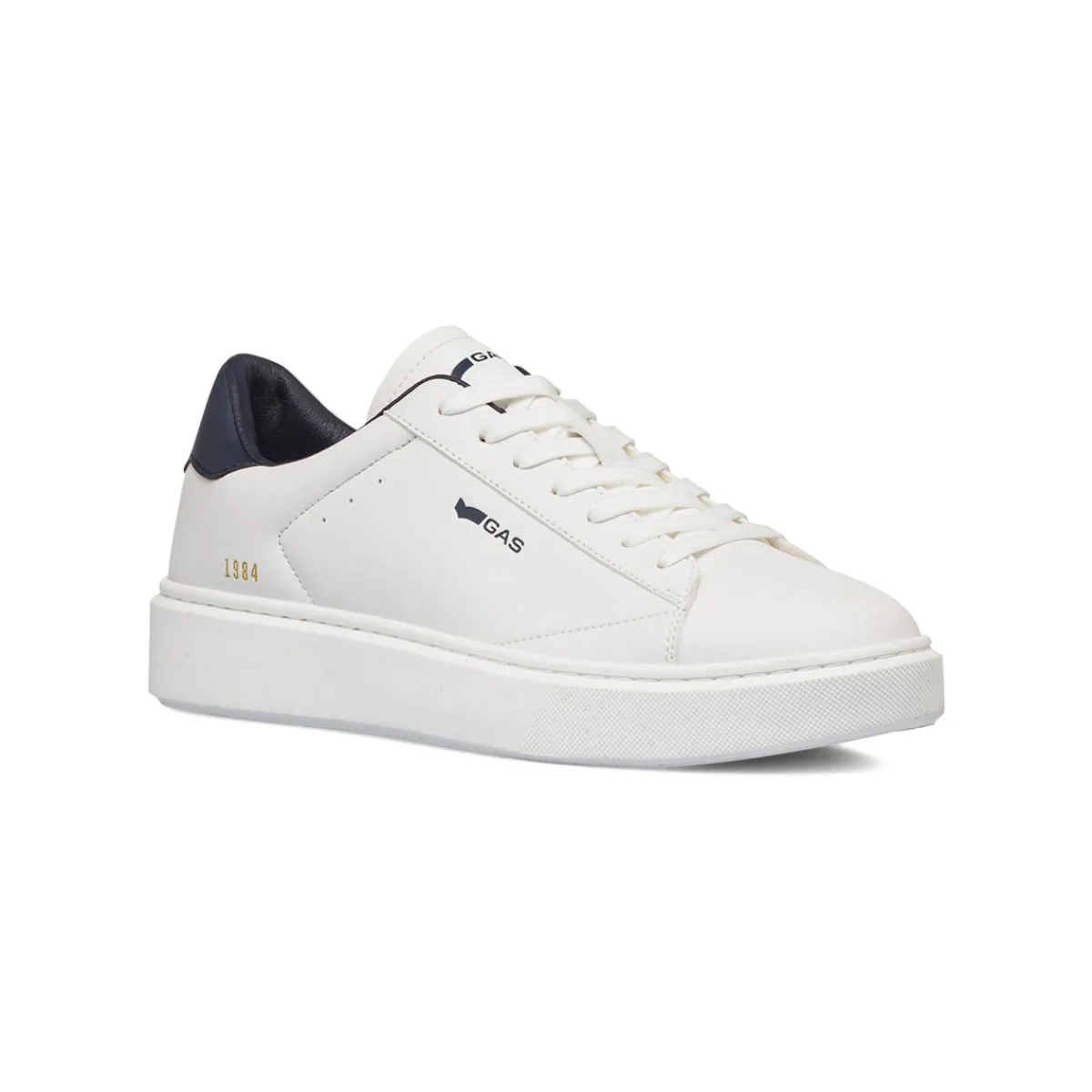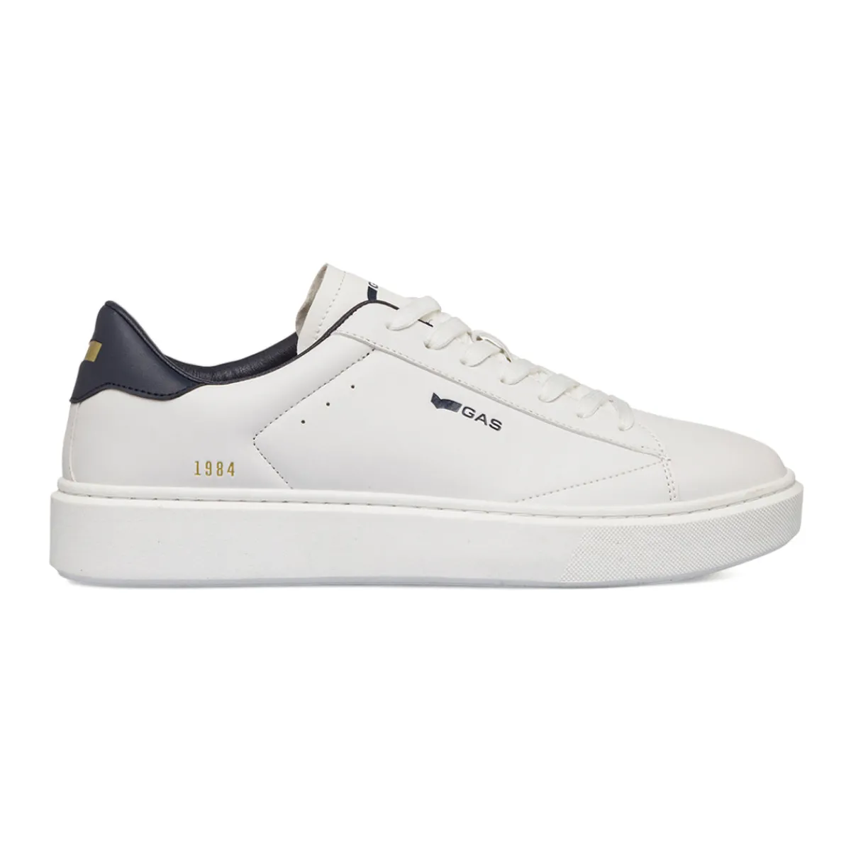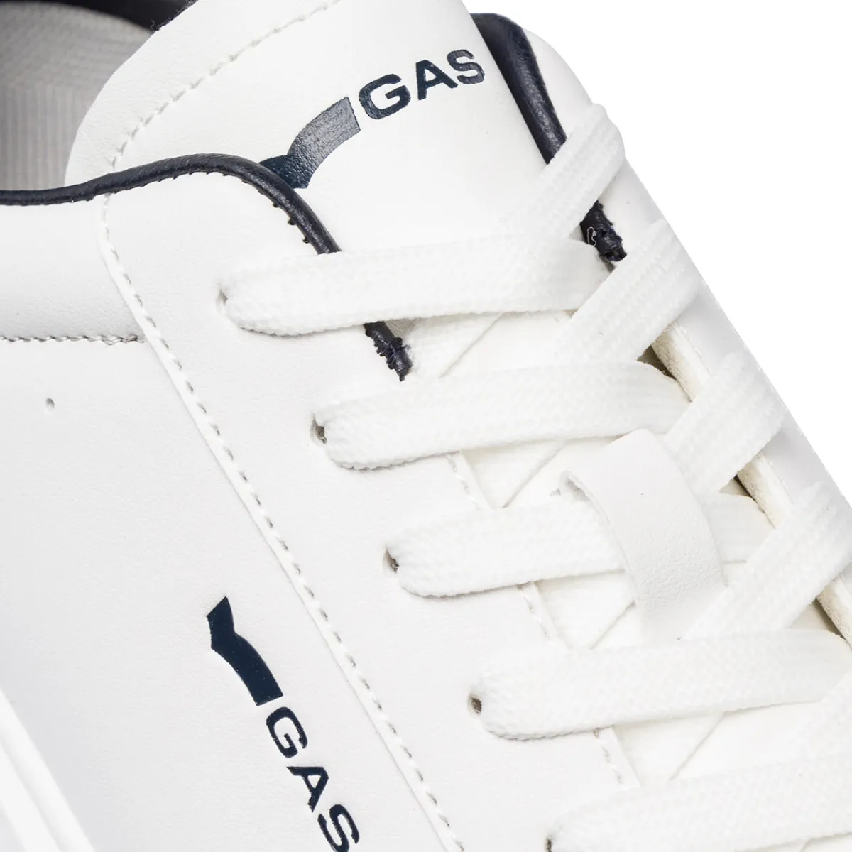 Sneakers casual da uomo Gas in similpelle bianche con dettaglio blu sul tallone, lacci tono su tono e logo sul lato, sul tallone e sulla linguetta.