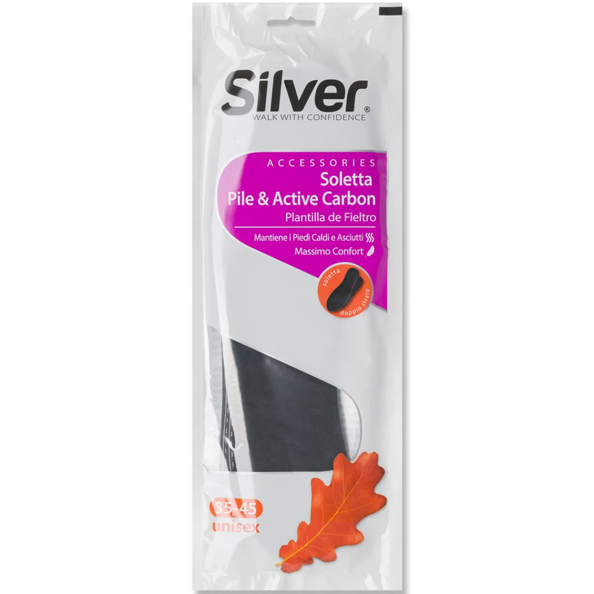 Coppia di solette unisex Silver Pile & Active Carbon in pile e lattice con carbone attivo. Lo strato in pile mantiene i piedi caldi. La soletta contiene carbone attivo per evitare cattivi odori. L’eccellente sospensione garantisce una sensazione di benessere sia durante una passeggiata che una corsa. Si adatta perfettamente senza deformarsi, ideale per tutti i tipi di calzature.