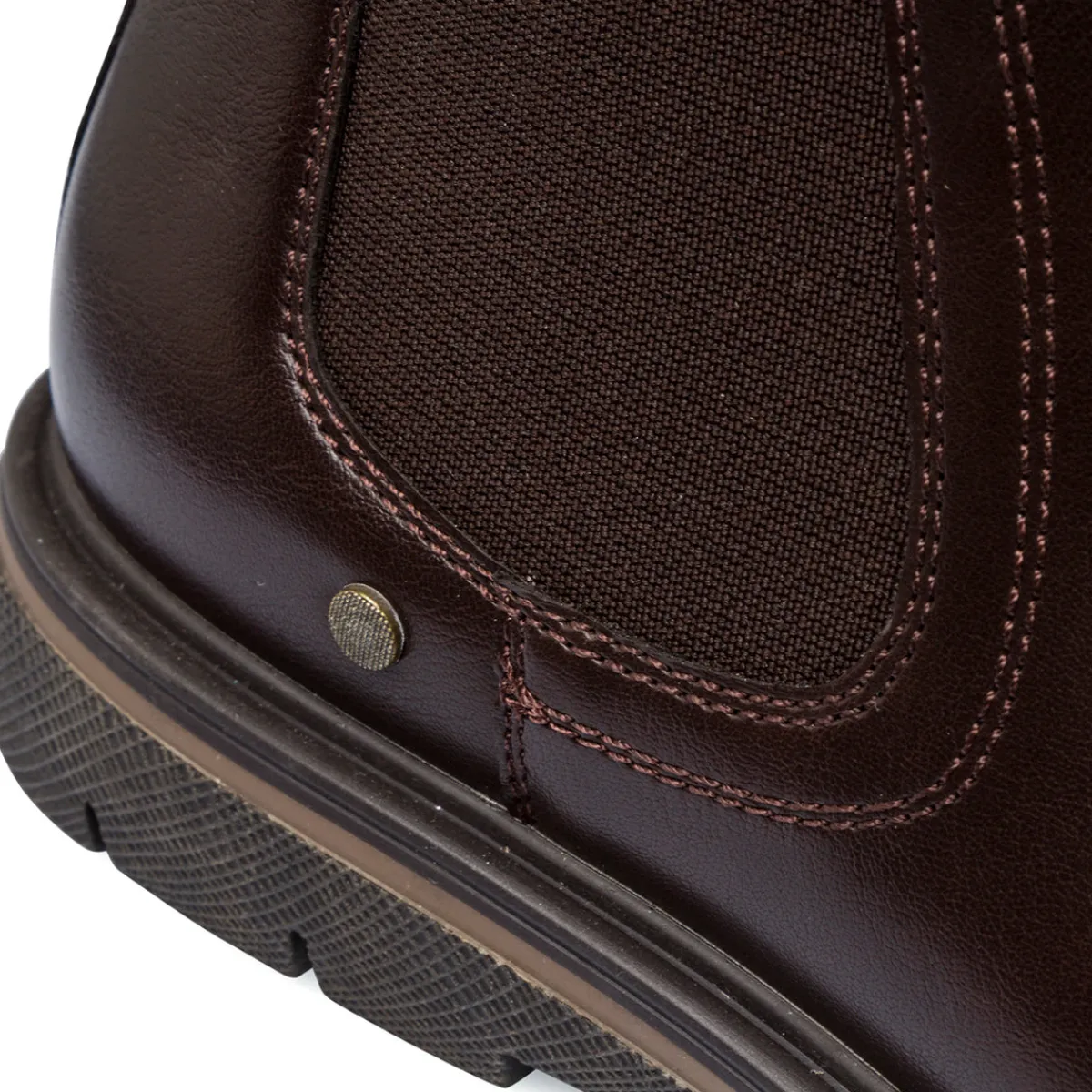 Stivaletti da uomo Riflessi Urbani in similpelle marrone con dettaglio cuoio sul retro, doppia fascia elastica laterale, cuciture a contrasto e tirante bicolore sul retro.