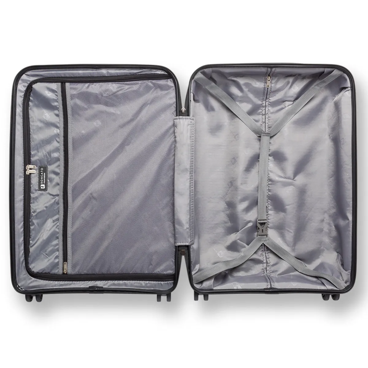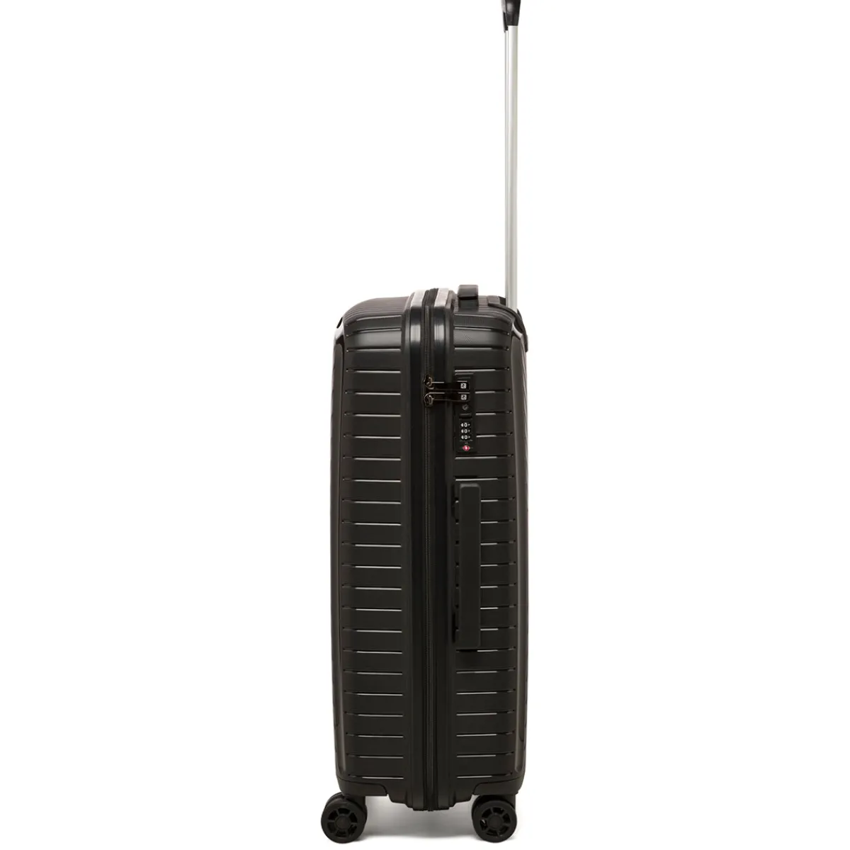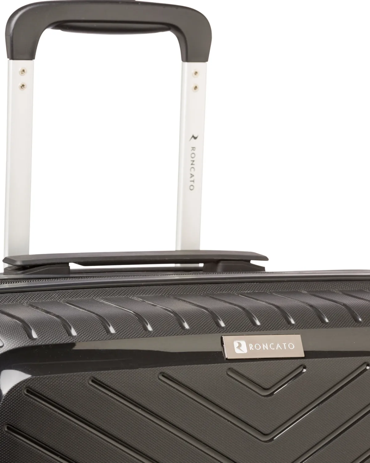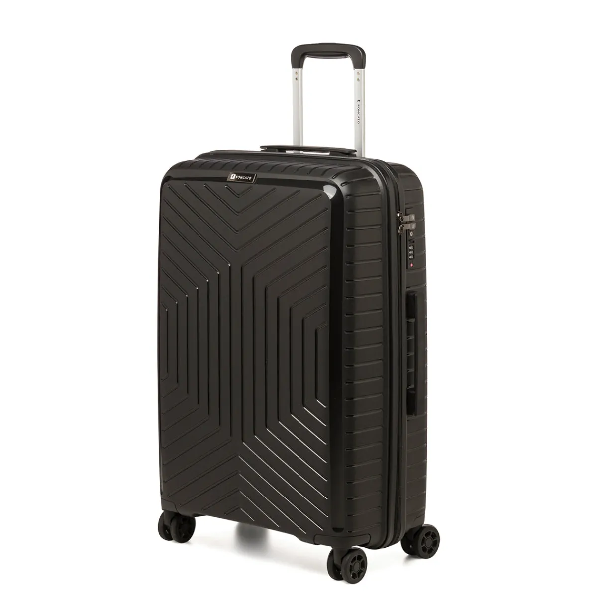 Valigia media Ciak Roncato Hexa in ABS colore nero a 4 ruote multidirezionali (360), chiusura TSA, manico retrattile, maniglia superiore integrata, interno foderato e scomparto principale con fasce ferma abiti.